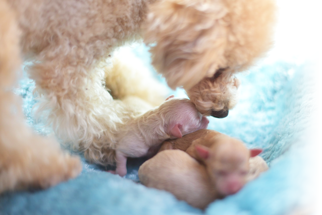 トイプードルに多いとされている遺伝性疾患である進行性網膜萎縮症(prcd-PRA)、変性性脊髄症(DM)、フォンウィルブランド病タイプI(vWD1)の遺伝を避けるため、すべての親犬に遺伝子検査を実施し、クリア判定の子のみを親犬としています。そのため、これらの遺伝子疾患で辛い思いをする子犬はおりません。